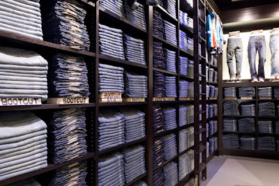 Os jeans estão ordenados de acordo com o corte e também com a lavagem. Os estilos são identificados com placas escritas à mão e as peças estão dispostas como se fossem livros nas prateleiras.