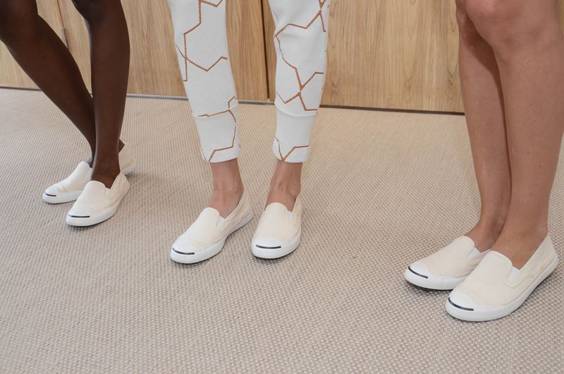 Os resultados de duas grandes parcerias também foram apresentados. A primeira, uma sandália com a alemã Birkenstock – um modelo forrado de pelo sintético. A segunda é em parceria com a Converse – a releitura do modelo Converse Jack Purcell agora desenvolvido especialmente em lona rústica Truck na cor cru.