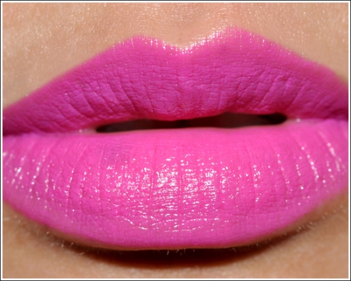 Esse swatch mostra o batom de pertinho. Tenho a impressão que o batom do Chapeleiro é um pouco mais escuro, mas às vezes é só por causa do flash. Olhando para a foto ali de cima da embalagem, dá pra ver que ele parece mais roxinho, mais próximo ao que vemos na tela.