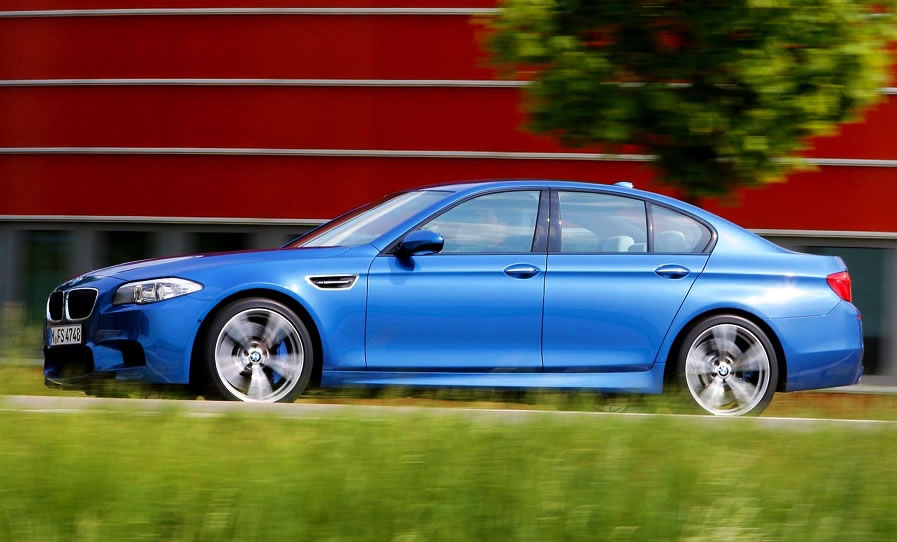 A nova BMW M5 2012, cujo modelo é conhecido como F10, recebeu todas as modificações aerodinâmicas exclusivas da série ‘M’, tais como parachoques esportivos, com grandes tomadas de ar no dianteiro e um discreto difusor no traseiro, saias laterais baixas e proeminentes, além das rodas de 20 polegadas, com logo ‘M’ e pneus nas medidas 265/35 na dianteira e 295/30 na traseira. Nas laterais dos paralamas dianteiros, a nova M5 conta com saídas de ar com pisca integrado e logo ‘M’.