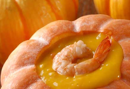 Acrescentar os camarões ao molho, colocar dentro da moranga já