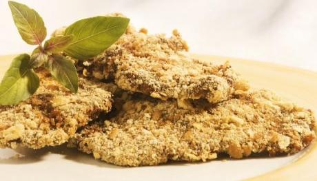 Empane nos biscoitos triturados e coloque na assadeira reservada. Leve ao forno por 20 minutos ou até dourar. Sirva com folhas verdes.