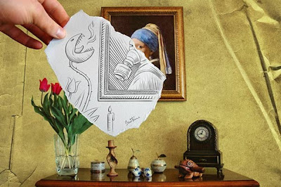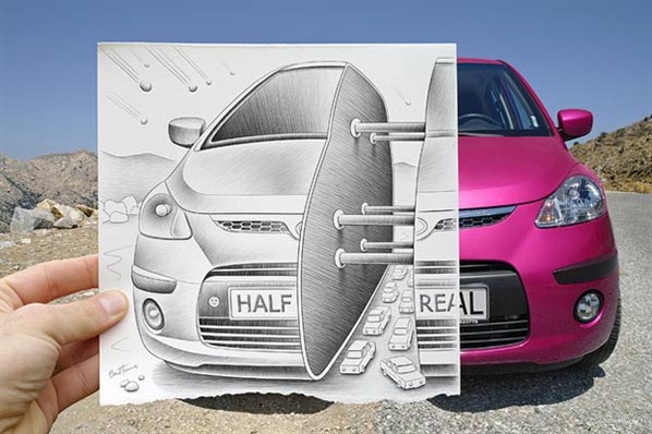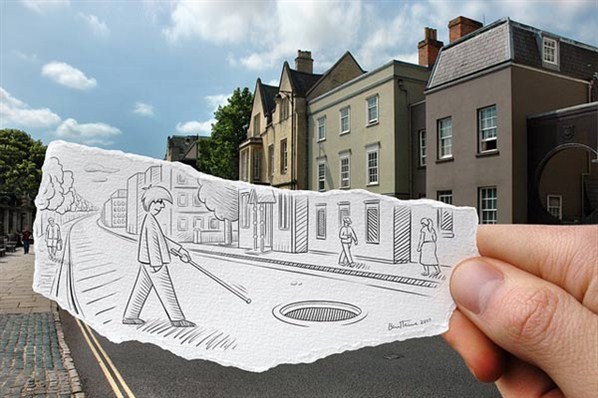 O artista belga Ben Heine usa desenhos feitos a lápis sobre papel branco para brincar e interferir na realidade estampada em fotos.