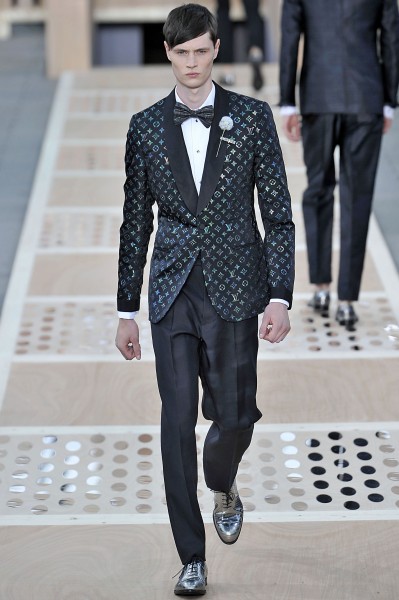 O desfile da Louis Vuitton para a primavera-verão 2014 trouxe grandes surpresas. Terno com camisa quadriculada, lenço no pescoço substituindo a gravata, calça social com jaqueta de couro, short bem curto.