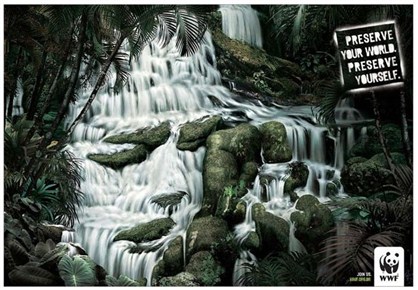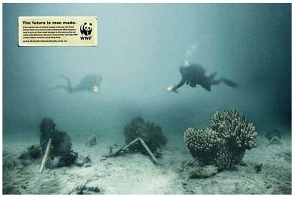 Por causa do aquecimento global, a cidade mostrada nesta campanha da WWF aparece debaixo d’água depois do derretimento das geleiras. O texto diz: “Aquecimento global está mudando as temperaturas do planeta rapidamente. Geleiras estão derretendo, o nível dos oceanos está subindo, a natureza está em revolta. Aja agora, economize energia e trate o planeta com respeito, ou viveremos em um mundo de águas”.