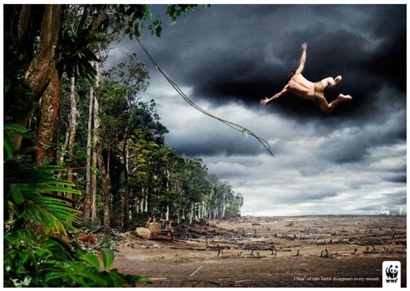 A preservação das florestas está diretamente ligada à da água e a de outros recursos naturais. É por isso que, na campanha acima, um personagem parecido com o Tarzan é surpreendido pela falta de árvores e está prestes a cair no chão.