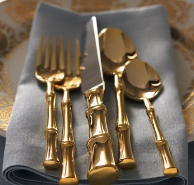 Se dinheiro não é problema, que tal comer com luxo? – e não só gastronomicamente falando, mas “utensilicamente” falando (se é que podemos dizer que este termo existe!).A loja Horchow colocou à venda um jogo de talheres criados pelo designer Ricci Silversmith que é um luxo só. Cada colher, cada garfo e cada faca possui o cabo como se fosse no formato de um bambu, mas de bambu mesmo ele não tem nada.As 20 peças do jogo de cutelaria são folheadas a ouro amarelo – o comprador também pode escolher prata, se preferir. Uma forma totalmente luxuosa de comer, ainda que o design seja menos formal.