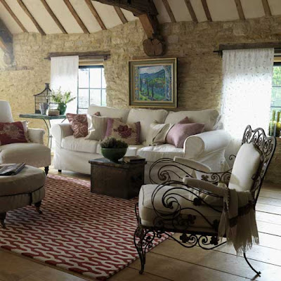 Já o estilo provençal (conhecido também como french country style), não é feminino em si. É uma mistura dos móveis clássicos regentes com outros desgastados ou rústicos. Na verdade o estilo provençal nos remete à vida rural dos franceses do sul da França com suas casas de campo em meio aos vinhedos e aos campos de lavanda. Vejo paredes desgastadas ou de pedra, móveis mais pesados de madeira, lustres de ferro, estofados forrados com tecidos nobres e detalhes em toile de jouy. Taças de cristal ou até mesmo vidro bem rústicas e pesadas e ainda mobiliário de ferro no jardim. Ao contrário do que vemos muitas vezes em revistas de decoração infantil ou outras, o branco não é a cor que predomina nas verdadeiras casas da Provence! Além dos tons suaves, o francês usa todo o espectro de cores na decoração, principalmente o amarelo ouro ou envelhecido, vermelhos, azul cobalto, verdes, ferrugem e tons de madeira crua ou mais escura até, muitas vezes. É um estilo mais rústico, comparado ao cottage, mas não menos charmoso!