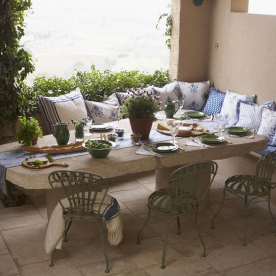 Já o estilo provençal (conhecido também como french country style), não é feminino em si. É uma mistura dos móveis clássicos regentes com outros desgastados ou rústicos. Na verdade o estilo provençal nos remete à vida rural dos franceses do sul da França com suas casas de campo em meio aos vinhedos e aos campos de lavanda. Vejo paredes desgastadas ou de pedra, móveis mais pesados de madeira, lustres de ferro, estofados forrados com tecidos nobres e detalhes em toile de jouy. Taças de cristal ou até mesmo vidro bem rústicas e pesadas e ainda mobiliário de ferro no jardim. Ao contrário do que vemos muitas vezes em revistas de decoração infantil ou outras, o branco não é a cor que predomina nas verdadeiras casas da Provence! Além dos tons suaves, o francês usa todo o espectro de cores na decoração, principalmente o amarelo ouro ou envelhecido, vermelhos, azul cobalto, verdes, ferrugem e tons de madeira crua ou mais escura até, muitas vezes. É um estilo mais rústico, comparado ao cottage, mas não menos charmoso!