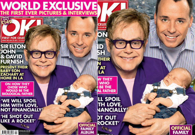 Elton John apresentou seu filho, Zachary Jackson Levon, pela primeira vez para a publicação inglesa “Ok!”. O músico aparece na capa da revista de celebridades segurando o bebê e ao lado do marido, o diretor e produtor de cinemaDavid Furnish. Em entrevista exclusiva, Elton falou sobre a emoção de ser pai no Natal, após tentativas frustradas em adotar duas crianças ucranianas.