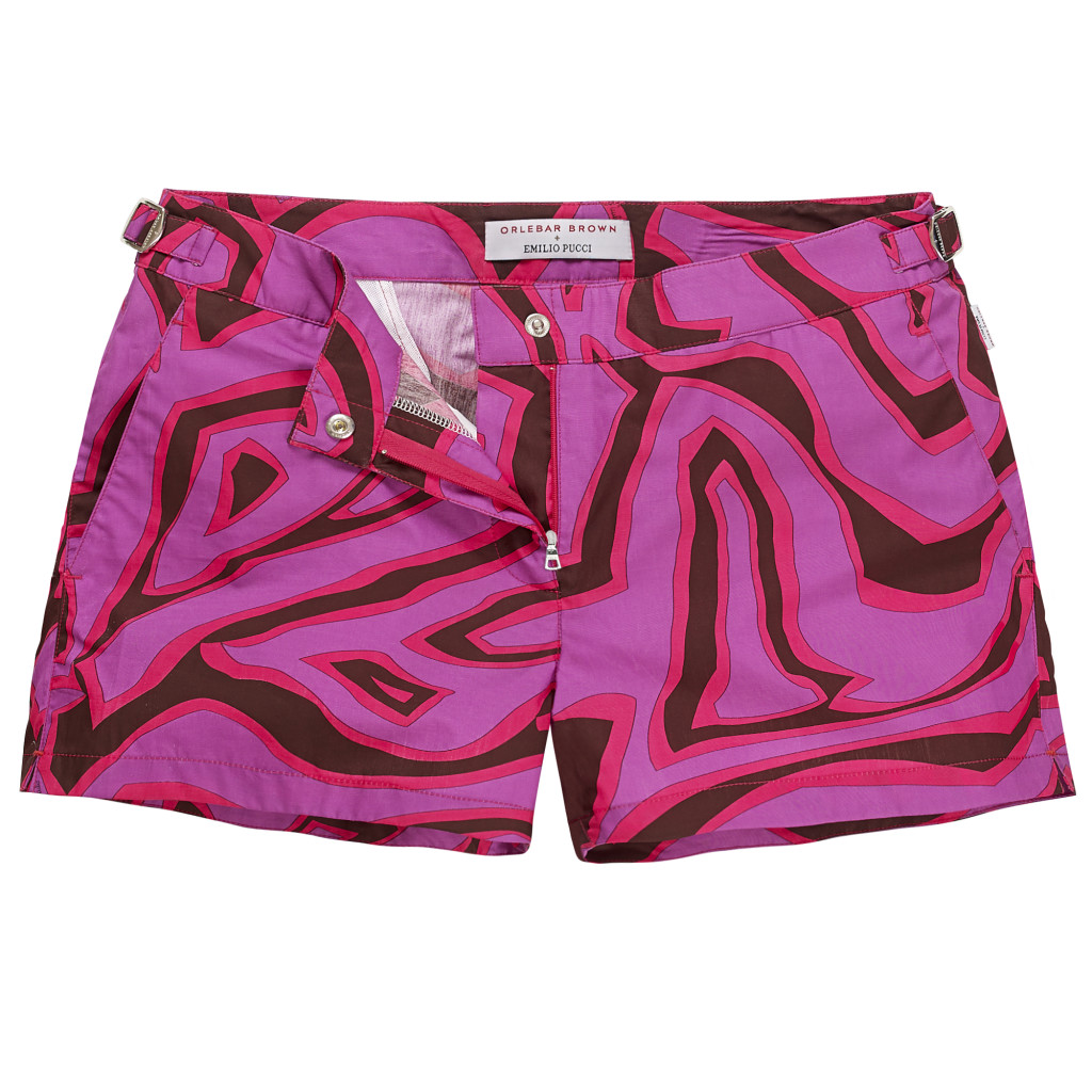 Os shorts de nadar, especialidade da Orlebar Brown, são o carro chefe da coleção: estampados com pequenos desenhos geométricos retirados dos arquivos Pucci, as prints resgatam a história da Pucci dos anos 1950, 1960 e 1970 com o colour blocking em desenhos espirais e gráficos como Baiadera, de 1978, Labirinto (desenho criado em 1950 e que o cantor Isaac Hayes usou durante uma de suas apresentações no início dos anos 1970) e a Dischi, desenvolvida em 1967. Essas estampas são uma das marcas registradas da marca e todas elas foram desenvolvidas pelo Marques Emilio Pucci.