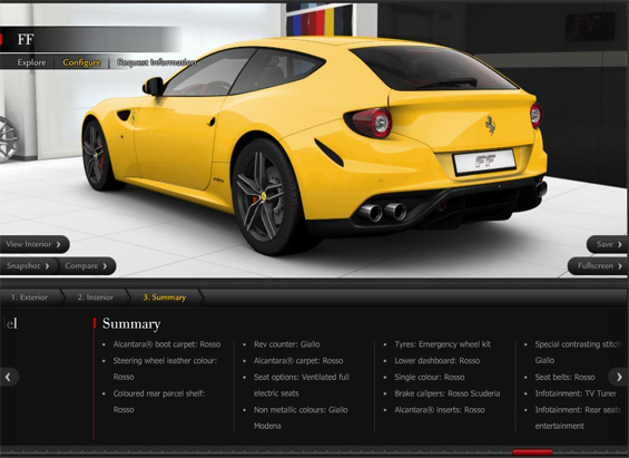 Por lá, você escolhe seu modelo favorito de Ferrari e configura da forma como você quiser: cor, acabamento, rodas, estofado. E depois ainda dá pra salvar e guardar na garagem virtual do site.