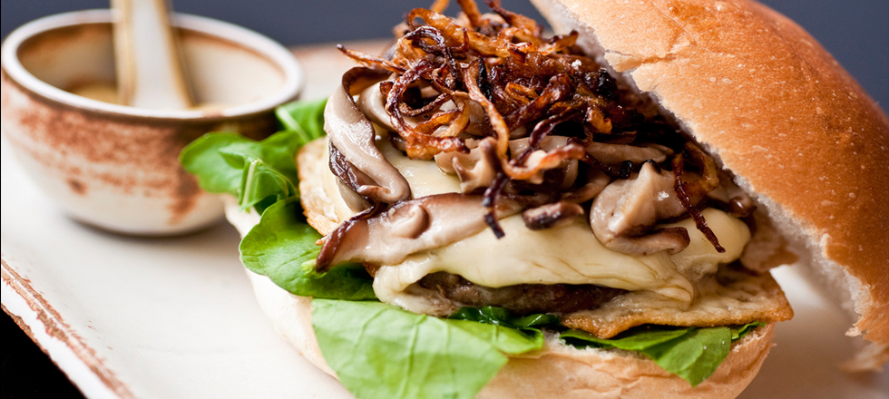 Corte o pão de hambúrguer ao meio e coloque a primeira camada de rúcula, depois o hambúrguer com queijo, shitake, cebola e cubra com a outra metade do pão.