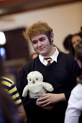 Fã vestido como personagem da série “Harry Potter” segura coruja de pelúcia durante fila em sessão de pré-estreia de “Harry Potter e o Enigma do Príncipe”.