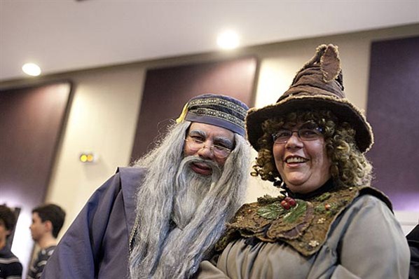 Fãs vestidos como os personagens Dumbledore e Professora Sprout posam antes de sessão de pré-estreia de “Harry Potter e o Enigma do Príncipe”, em shopping de São Paulo.