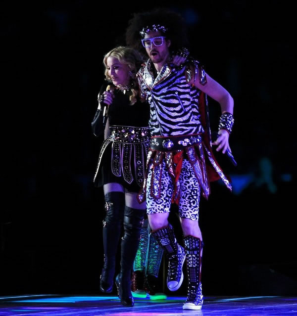 Depois, interpretou “Music”, com direito a participação especial da dupla LMFAO (do hit “Party Rock Anthem”). Logo em seguida, foi a vez de Nicki Minaj e da polêmica M.I.A. cantarem “Give Me All Your Luvin” junto com Madonna.