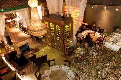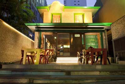 O responsável pelo ambiente é o arquiteto André Luque, que usou ripas de demolição com cortes geométricos para criar um espaço interessante e diferenciado. Cortinas de voil dividindo os ambientes, pé-direito alto, luz natural, toques de verde e uma charmosa varanda, são alguns dos elementos que compõem o espaço do restô. Nos 400m² da casa estão espalhados moveis retrô luminárias originais, brinquedos antigos e artwork, tudo também à venda no Tavares.