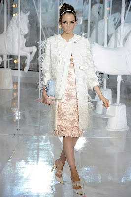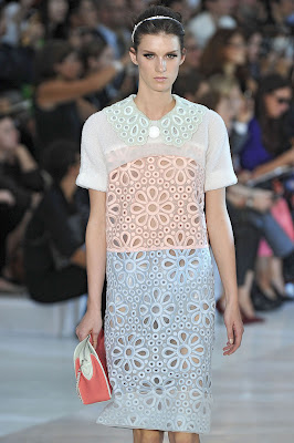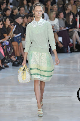 Nenhum comentário a respeito da ida de Marc Jacobs pra Dior ou da permanência dele na direção criativa da Louis Vuitton. Se ele sair, esse desfile de primavera-verão 2012 na Semana de Moda de Paris seria seu último na LV. De qualquer forma, aapresentação-show não teve clima de despedida: se o inverno passado foi fetichista e noir, o verão vem luminoso, todo em branco e cores claríssimas, cheio de bordado inglês em forma de flores. Bem retrô e ladylike, encheu os olhos de quem assistiu ao vivo: as modelos saíam de um grande carrossel. Pra fechar, Kate Moss reaparece – e ao contrário do desfile passado, no qual ela fumava um cigarro e usava uma hot pant, dessa vez ela se veste de princesinha do bem com direito a pluminhas no vestido eescarpin branco. O verão é meigo pra Marc!