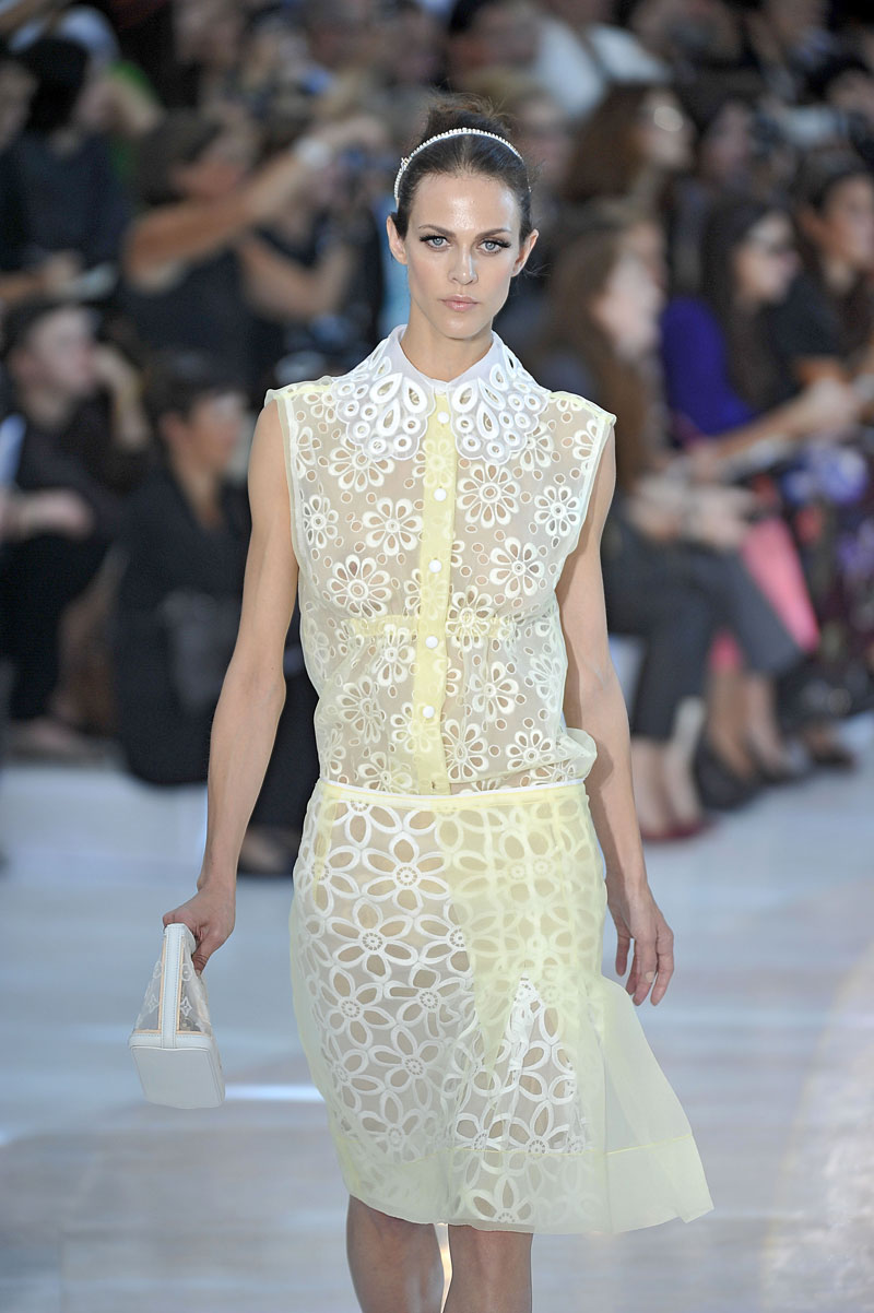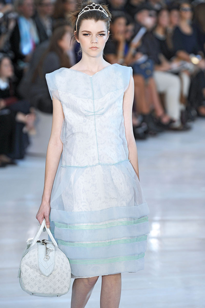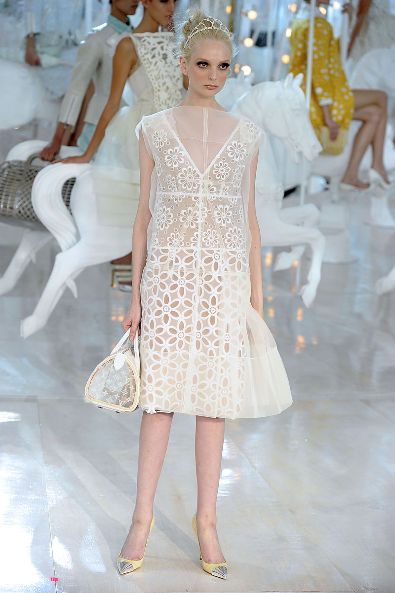 Nenhum comentário a respeito da ida de Marc Jacobs pra Dior ou da permanência dele na direção criativa da Louis Vuitton. Se ele sair, esse desfile de primavera-verão 2012 na Semana de Moda de Paris seria seu último na LV. De qualquer forma, aapresentação-show não teve clima de despedida: se o inverno passado foi fetichista e noir, o verão vem luminoso, todo em branco e cores claríssimas, cheio de bordado inglês em forma de flores. Bem retrô e ladylike, encheu os olhos de quem assistiu ao vivo: as modelos saíam de um grande carrossel. Pra fechar, Kate Moss reaparece – e ao contrário do desfile passado, no qual ela fumava um cigarro e usava uma hot pant, dessa vez ela se veste de princesinha do bem com direito a pluminhas no vestido eescarpin branco. O verão é meigo pra Marc!