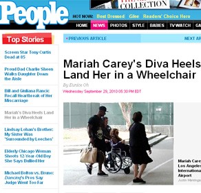 Segundo a revista ‘People’, a cantora chegou da turnê sem poder caminhar. ‘Mariah torceu o tornozelo em Cingapura e devia ter levado sapatos mais confortáveis, mas ela não tinha nenhum’, informou a relações públicas da cantora, Cindi Berger, ao site ‘E!News’.