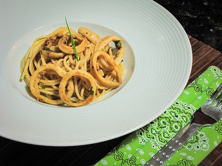 Ferva a água para cozinhar o macarrão, como de costume. Enquanto isso, refogue os anéis de lula em um fio de azeite e 1 colher de sopa de alho picadinho. Deixe refogar por uns 2 minutos mais ou menos e depois acrescente o restante dos temperos: aceto reduzido, mix de pimenta, Mrs. Dash Lemon Pepper e cebolinha (reserve um pouco para servir) e deixe o sal por último, dependendo nem vai precisar, experimente antes de acertar o sal. Não esqueça de abaixar o fogo para não queimar. É um processo rápido, senão a lula fica borrachuda. Escorra o espaguete e misture na lula, mexendo bem e finalizando com mais um fio de azeite e cebolinha. Tá pronto.