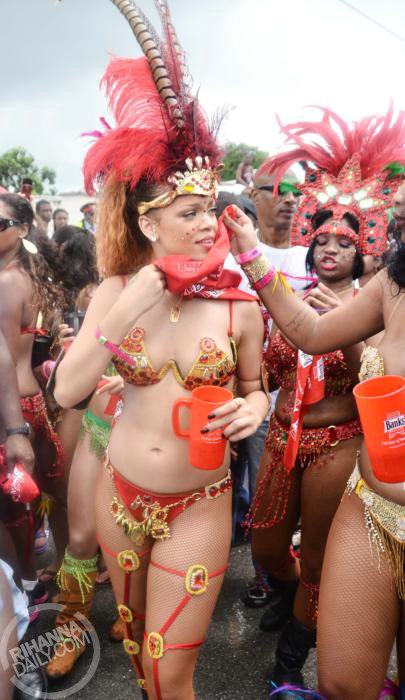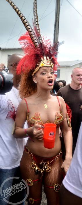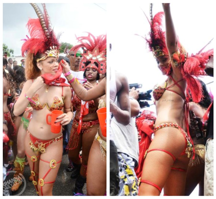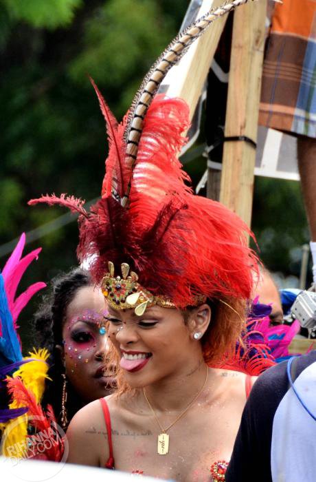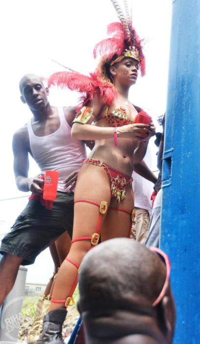 Rihanna mostrou que não renega suas raízes, dançando a tradicional soka, com passos em que a mulher se empina, rebola e o homem vem por trás. Na mão, uma caneca com refil ilimitado de rum.