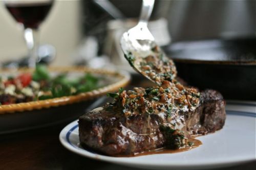 4. Aqueça uma frigideira, coloque a manteiga e a carne e deixe dourar em fogo forte sem apertar a carne.