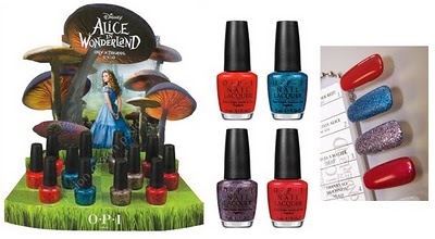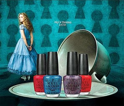 A marca americana O.P.I fez 4 cores especiais em uma coleção limitada, que leva o mesmo nome do longa. Marca registrada da marca, os frasquinhos levam sempre frases como nomes: “Absolutely Alice“, “Mad as a Hatter“, “Off with her Red!” e “Thanks so Muchness!” são os da vez. São 2 tons de vermelho, um prateado e outro azul (sendo que esses dois últimos são feitos de glitter puro)