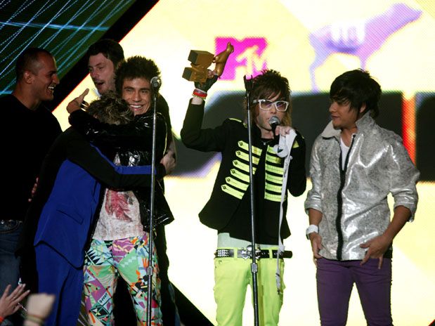 Os garotos do Restart comemoram um dos cinco prêmios que ganharam no VMB 2010 e eu também vaiava aqui de casa, péssimo, que país é esse?